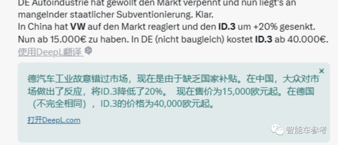 还有人认为,德国政府没有像中国这样补贴电动车,属于自己放弃了这个产业: