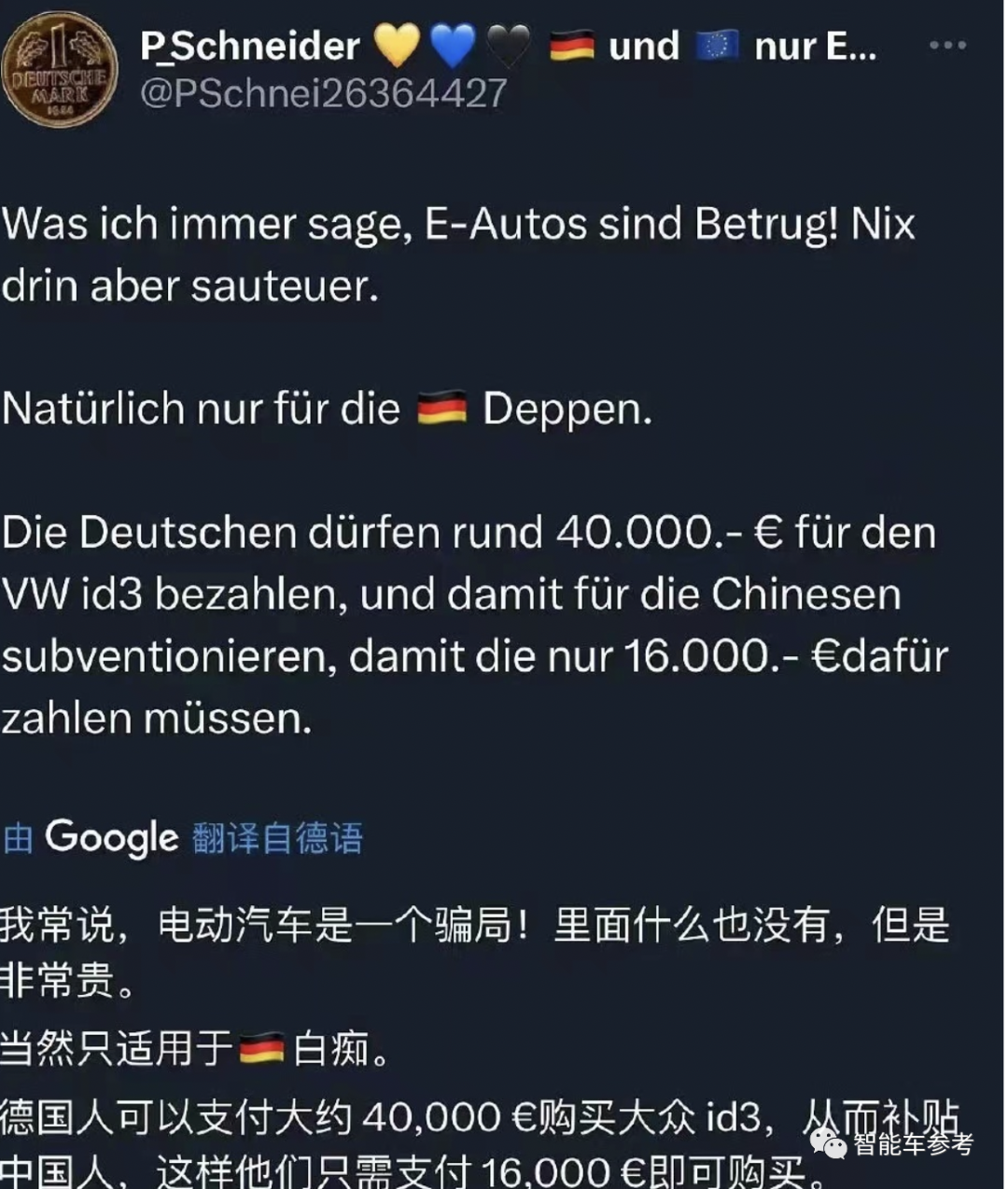 “电动车是骗局,傻子才买”、“德国人其实在掏高价补贴中国车主”。