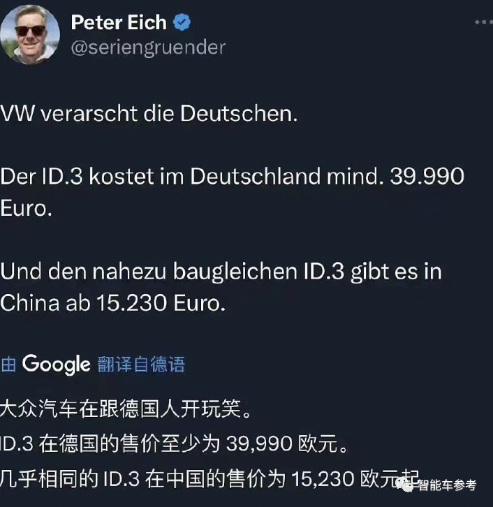 因为ID.3在德国售价39990 欧元起,相当于人民币32万左右。几乎是中国售价的3倍。