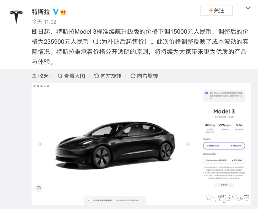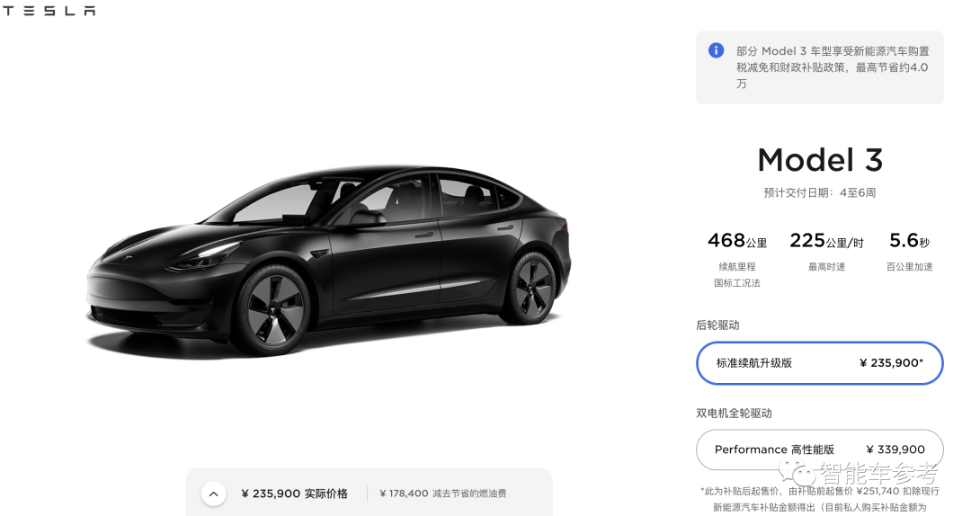 官方最新调整后,特斯拉Model 3标准续航升级版,调整降至235900元人民币(补贴后),这波一刀砍掉1万5千元。