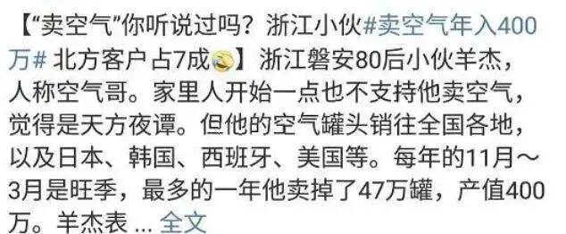由于北方地区的雾霾污染,人们迫切需要呼吸新鲜空气。所以“空气哥”的生意特别火爆,最好的时候能卖出47万瓶空气罐头。