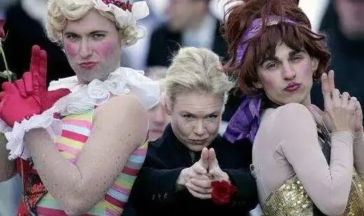 一个头发花白的老头,脱了西装,拿出长筒丝袜、高跟鞋、胸罩,然后一点一点把自己塞进了一件黑色裙子里。