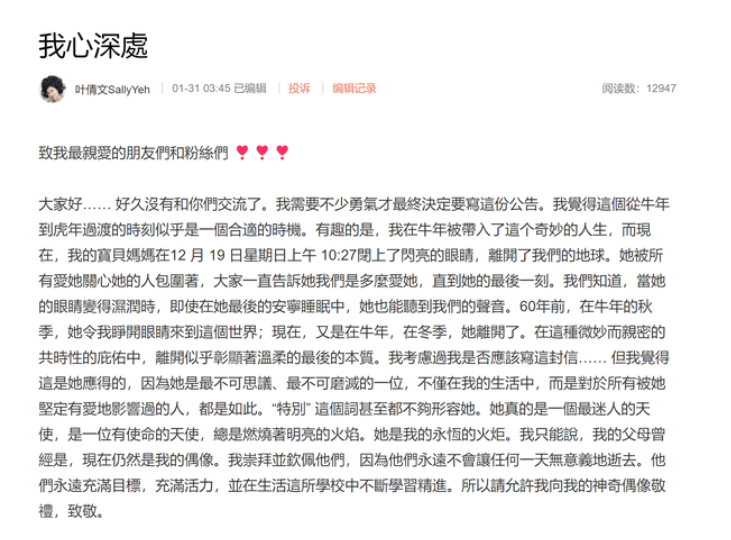 叶倩文撰写了3000字的长文来悼念母亲的一生。