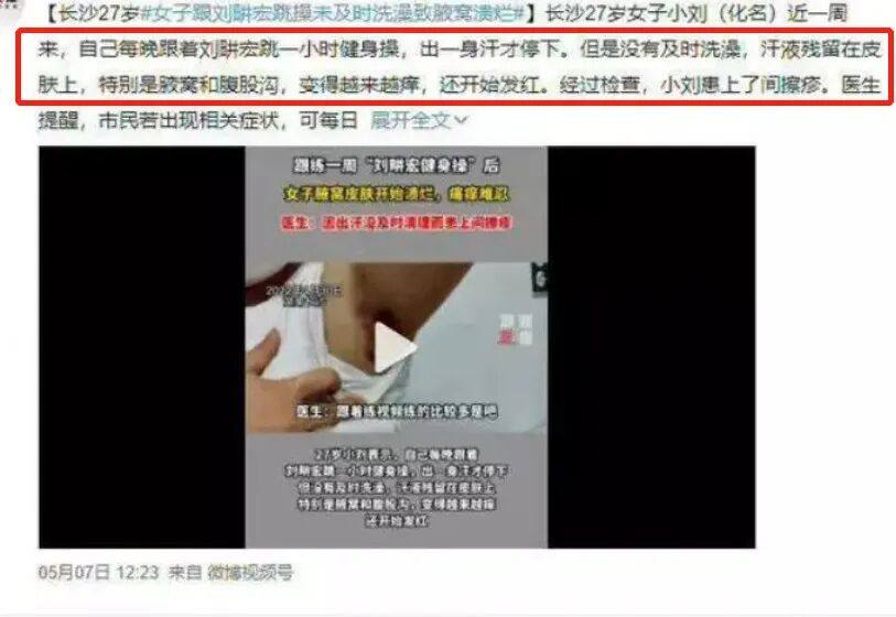 有媒体报道,这名女士跟着跳操一周后,因没有及时洗澡导致腋窝溃烂。新闻一出,就在网上引起了热议。