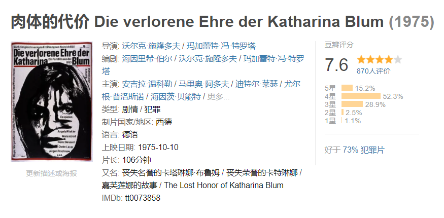 小说还被翻拍成了电影——《肉体的代价》。影片成为1975年西德最轰动、上座率最高的电影之一,至今豆瓣评分高达7.6分。