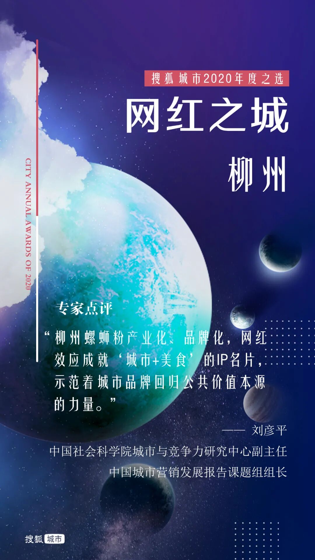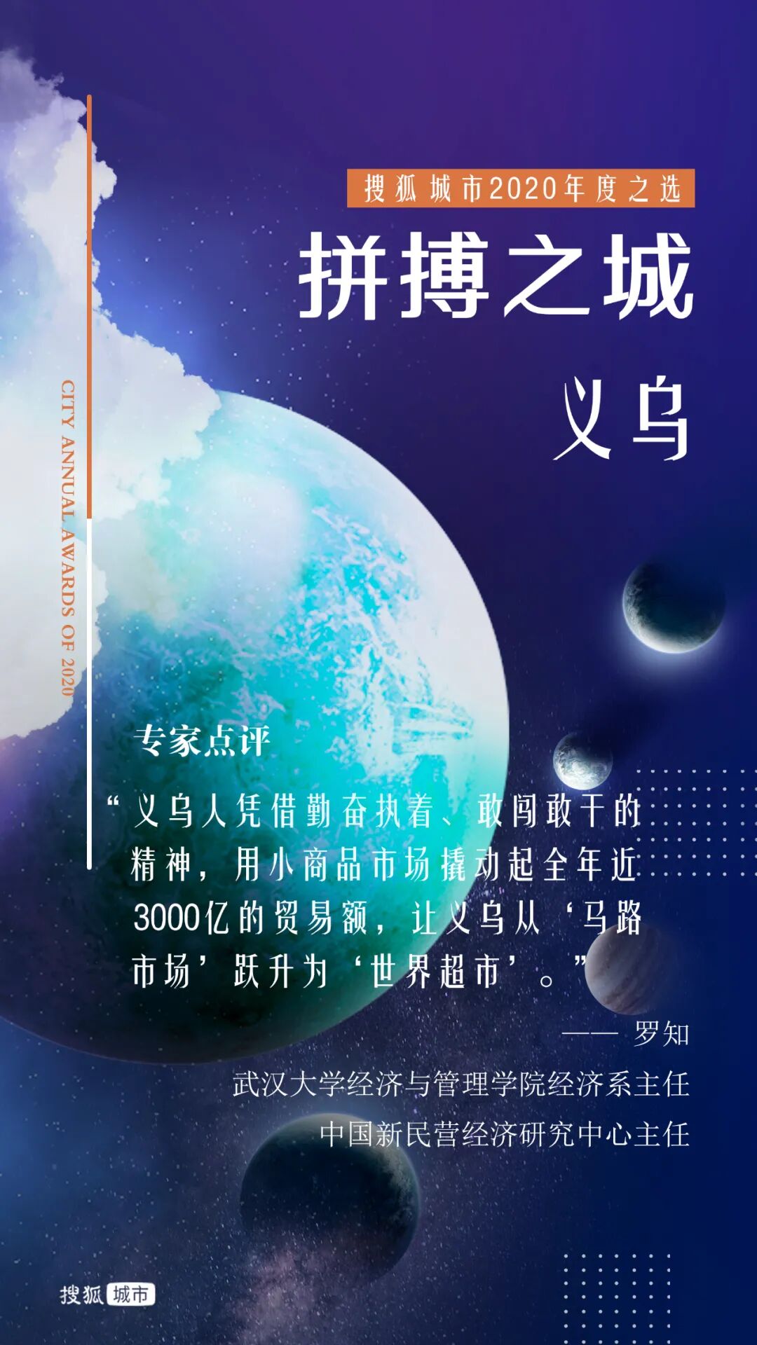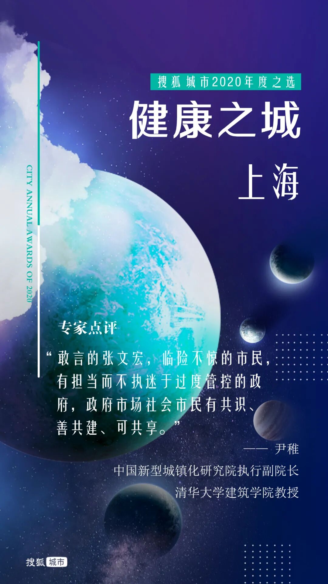 去年岁末,搜狐城市发起“年度十大城市”评选,通过专家评审和网友投票的综合考量方式,选出财富、逆袭、暖心、才智、胆识、健康、网红、包容、拼搏、宜居之城。投票通道自2020年12月31日开启,到2021年1月10日关闭。11天内,共计收到超过972万张网友投票。10位城市发展领域专家组成的评审团和网友共同选出了“搜狐城市2020年度城市”。