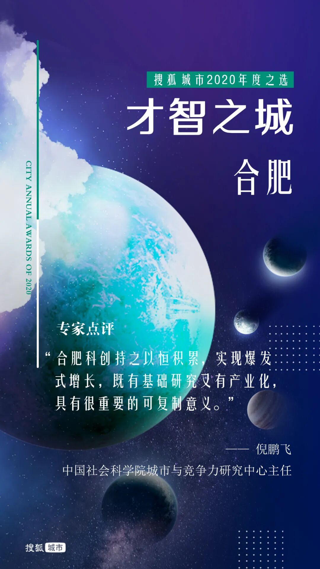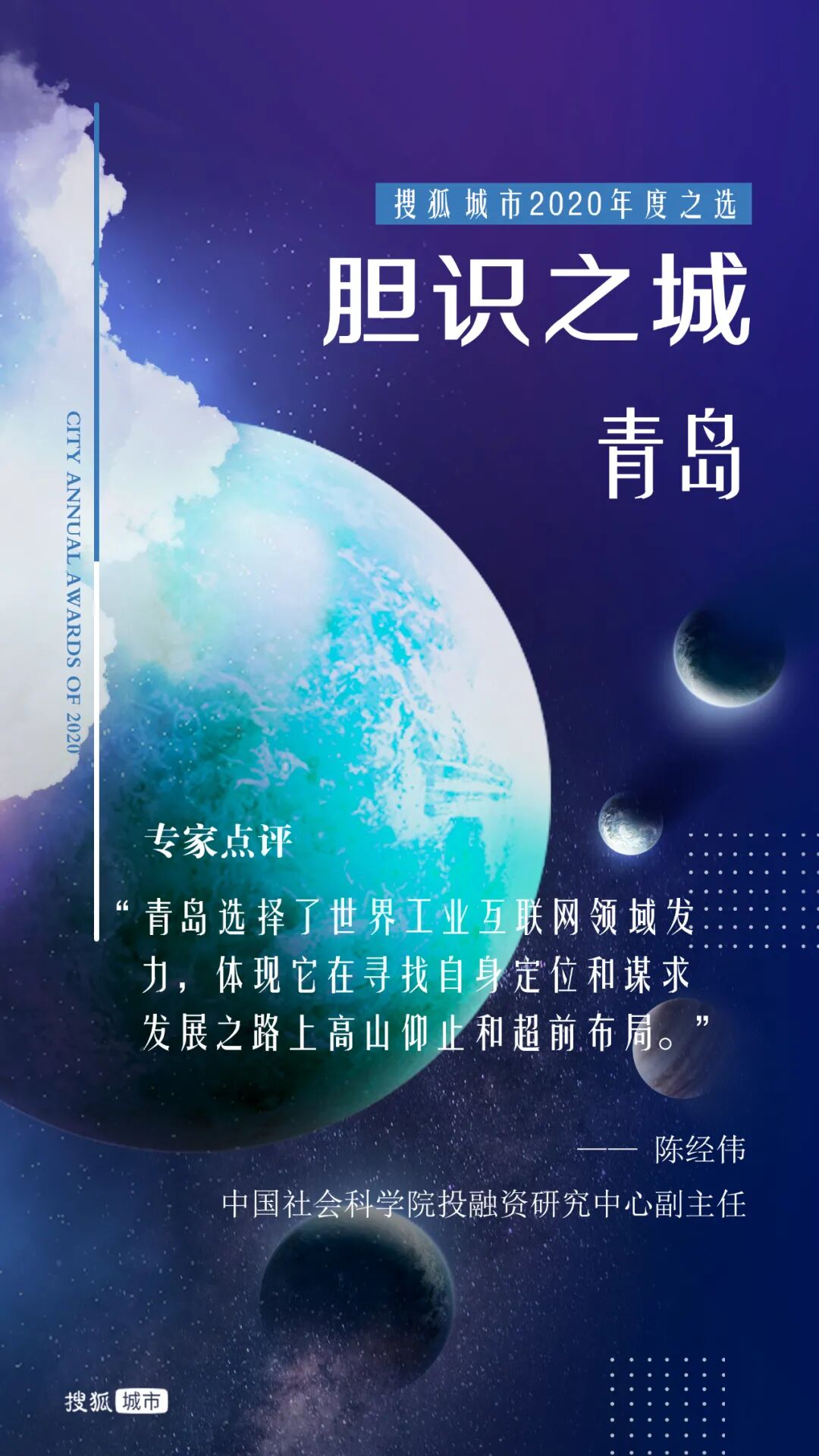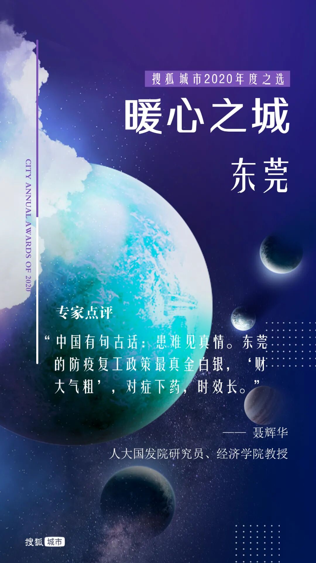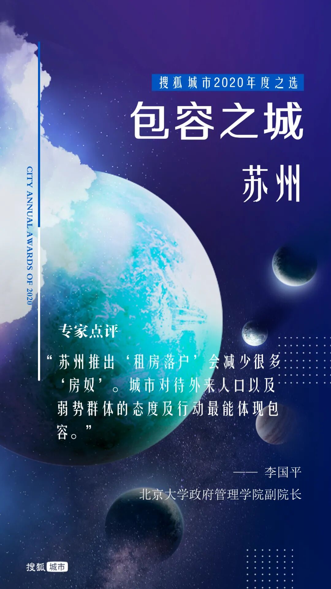 去年岁末,搜狐城市发起“年度十大城市”评选,通过专家评审和网友投票的综合考量方式,选出财富、逆袭、暖心、才智、胆识、健康、网红、包容、拼搏、宜居之城。投票通道自2020年12月31日开启,到2021年1月10日关闭。11天内,共计收到超过972万张网友投票。10位城市发展领域专家组成的评审团和网友共同选出了“搜狐城市2020年度城市”。