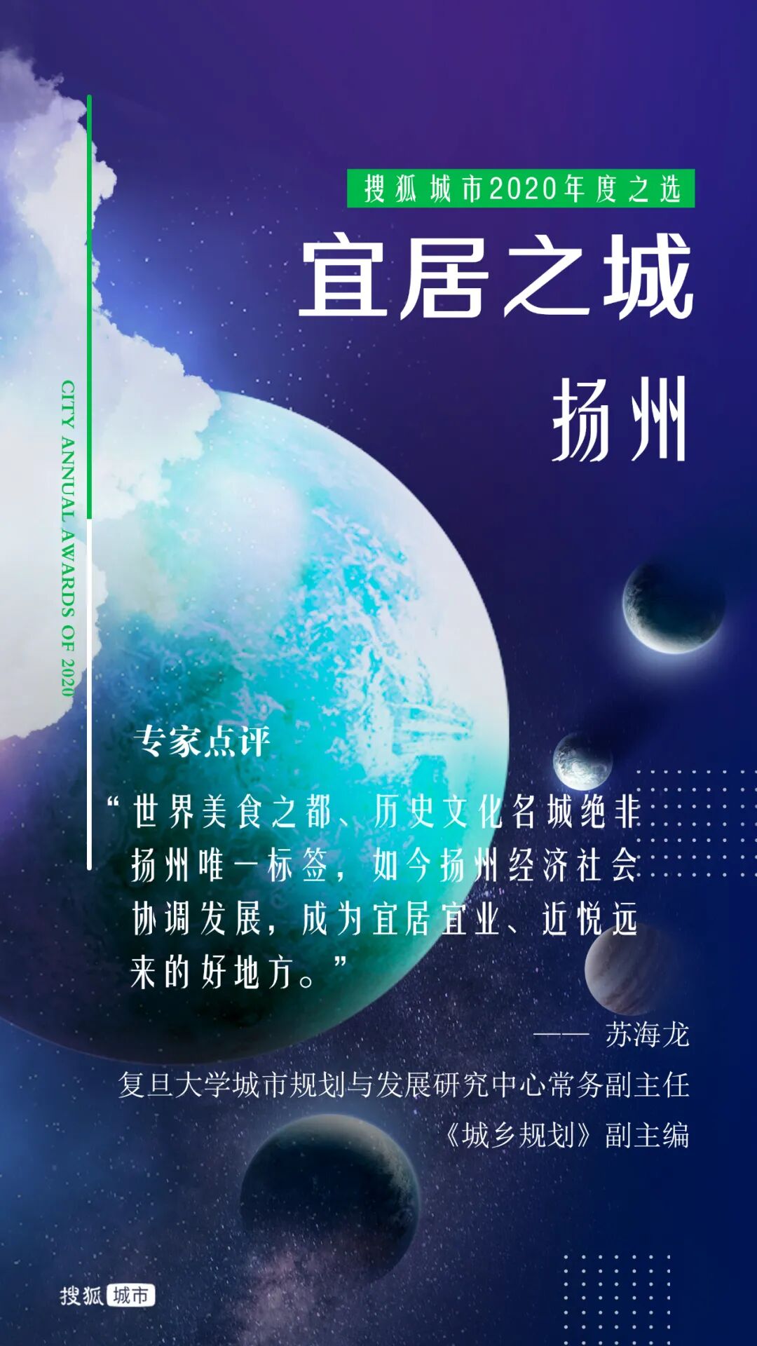 复旦大学城市规划与发展研究中心常务副主任,《城乡规划》副主编苏海龙评价,“提到扬州,人们总会想起李白的‘烟花三月下扬州’,想起王士祯的‘绿杨城郭是扬州’,世界美食之都、历史文化名城和著名旅游城市是扬州的名片,但绝不是扬州的唯一标签。”