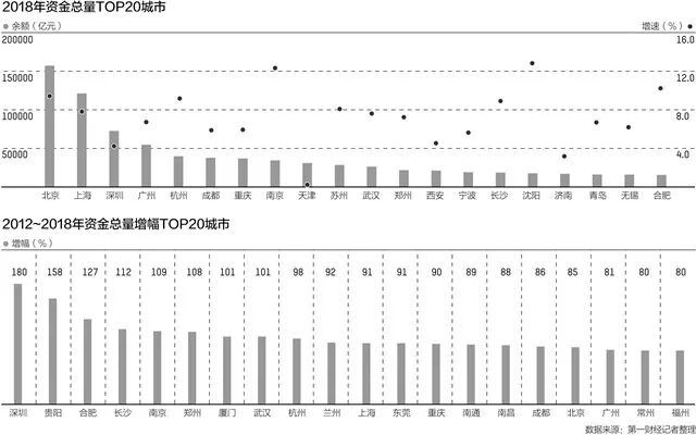 第一财经梳理了2018年底40个主要城市的资金总量,京沪资金总量遥遥领先,前10名中,北方只有两市入选,而东北、华北的不少城市增幅都较低。