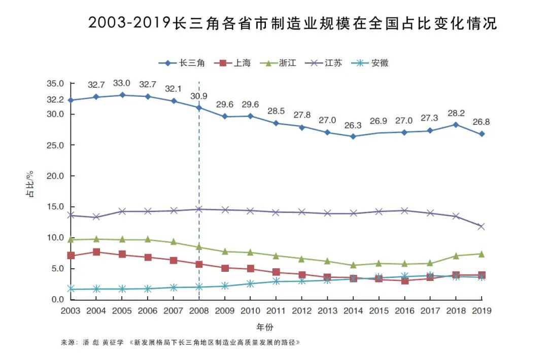 在 2008 年之前,长三角地区制造业全国整体占比相对稳定,在30% 左右,但已经出现下降的苗头,最高是2005年的33%。2008 年国际金融危机以后,长三角地区的制造业在全国占比持续下降,2019 年降至 26.8%,与最高时相比下降了 6.2 个百分点。