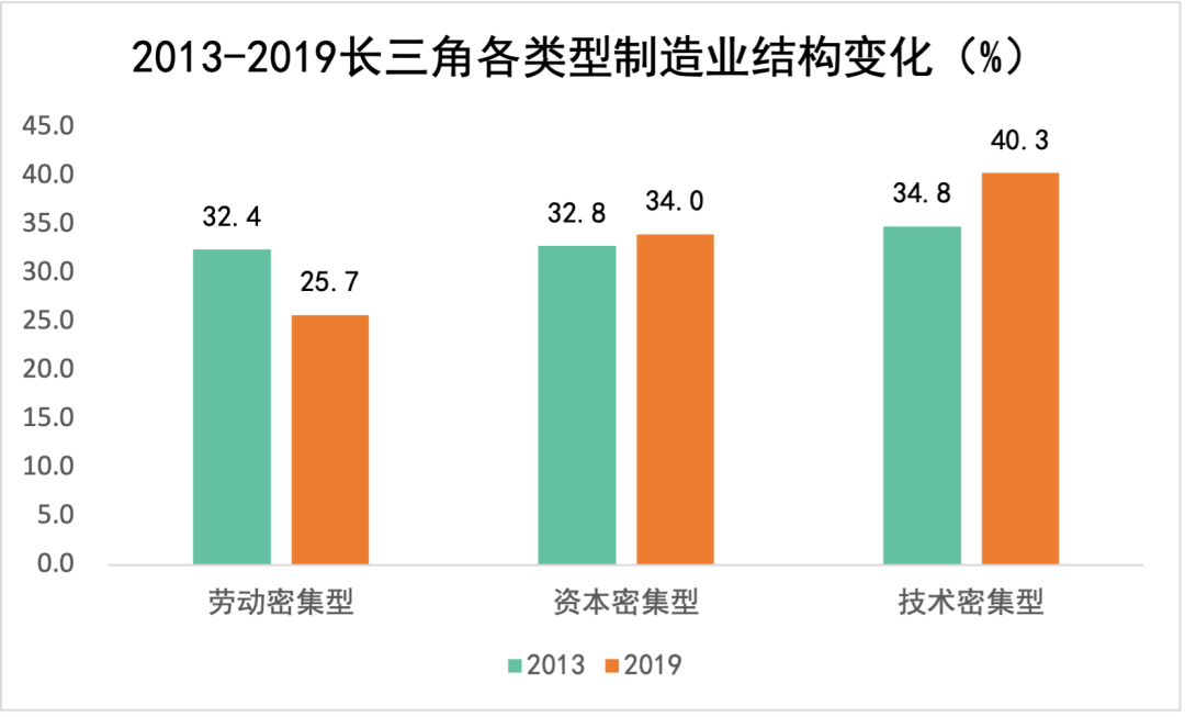 具体来讲,2013-2019年长三角劳动密集型、资本密集型和技术密集型产业的占比分别从 32.4%、32.8%和34.8% 调整优化为 25.7%、34.0% 和 40.3%,劳动密集型产业占比下降了6.7个百分点,资本密集型和技术密集型产业占比分别上升了1.2 和5.6个百分点。