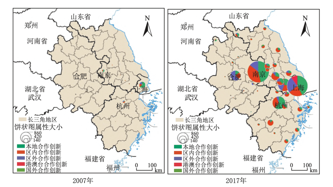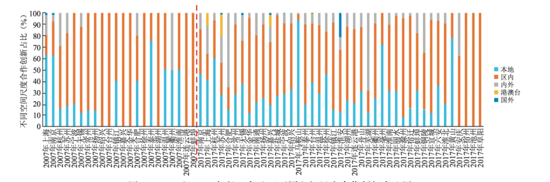 2007和2017年长三角地区不同空间尺度合作创新占比图