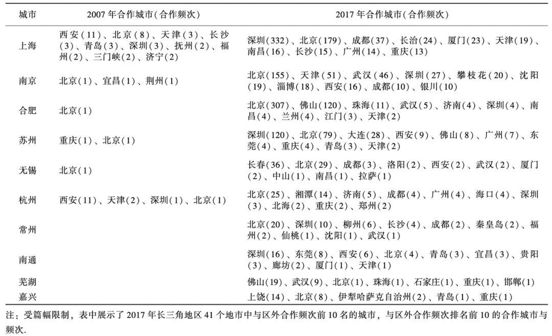 城市创新能力是长三角地区选择区外合作伙伴的关键因素,2007~2017年,区外创新合作的重要知识源由西安和北京变为北京和深圳。如上表所示,2007年上海与西安(11)和北京(8)合作密切、杭州与西安(11)合作密切,主要是因为上海交通大学和浙江大学与西安电子科技大学有着较为密切的创新合作关系。