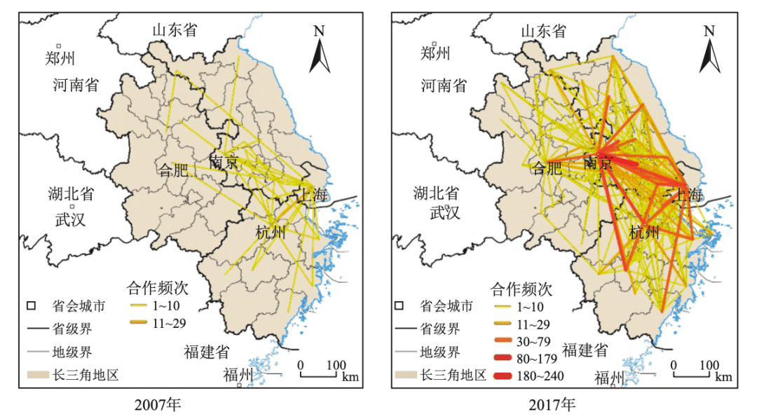 从合作创新总量来看,2007~2017年,长三角地区的合作创新次数显著增多;2007年合作创新主要集中在上海、南京和杭州;2017年上海、南京、杭州、苏州、合肥等经济发达城市的合作创新密度较高。