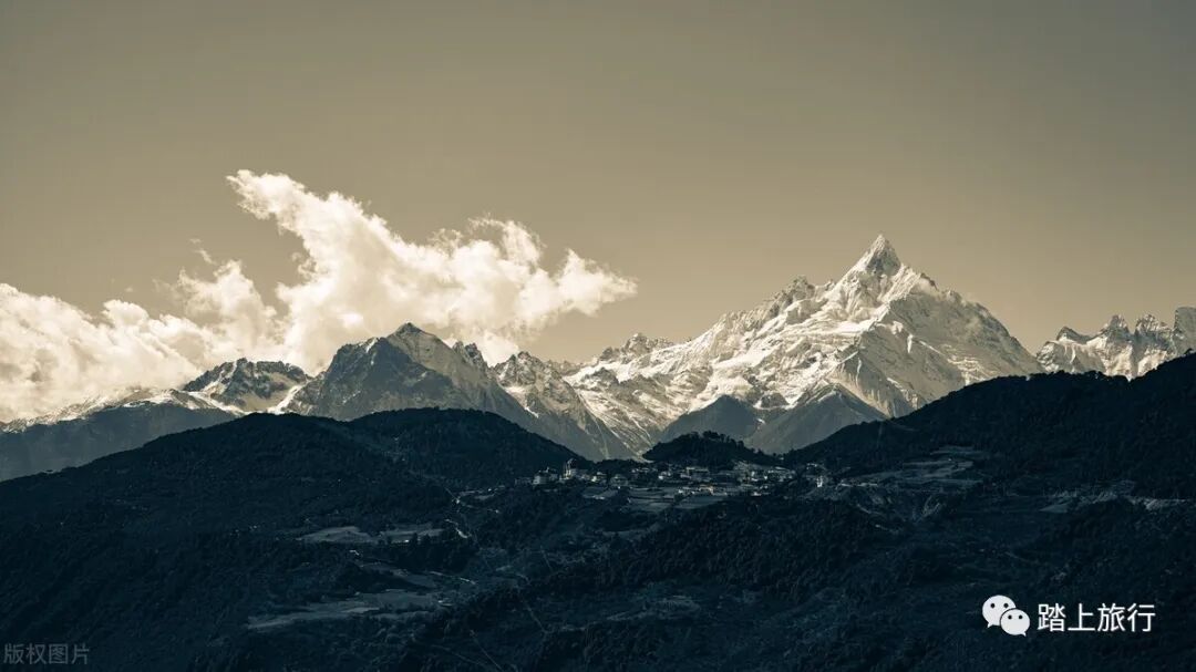 观看梅里雪山有两个位置,一个是飞来寺,再一个就是雾浓顶。雾浓顶是观看梅里雪山全景的最佳位置,这里拍摄梅里雪山可以将远方的飞来寺村和下面的河谷作为前景,可看到雾浓顶村的炊烟和澜沧江的峡谷云雾,视野里的梅里雪山不显突兀,更加大气磅礴。