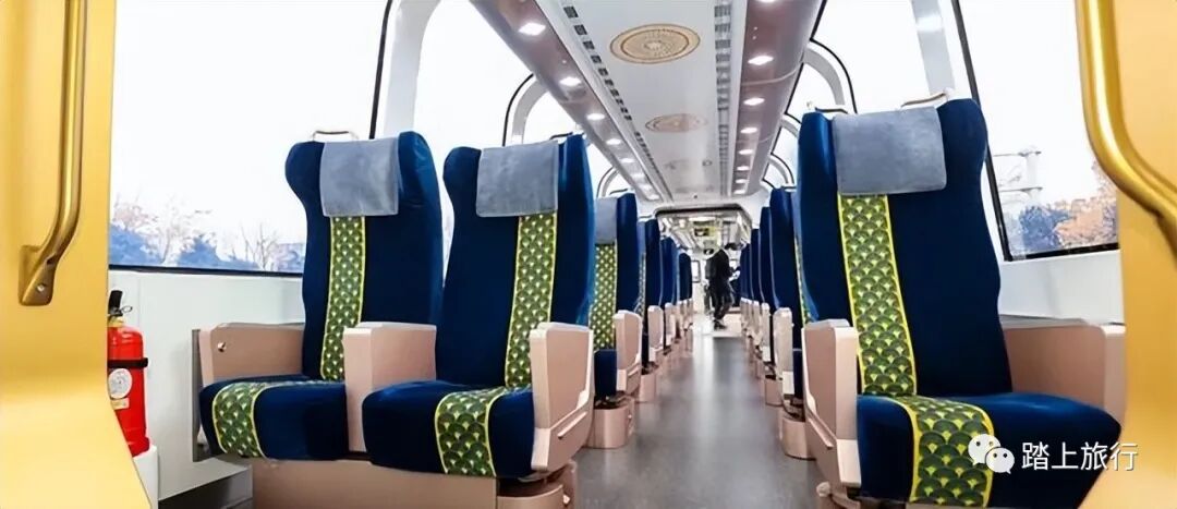 列车配置了电动调光的大型观景窗,可以根据日照强度调节车窗玻璃颜色。顶部采用上弧结构,乘客可以全方位欣赏巍峨壮美的玉龙雪山、湛蓝如玉的湖水与气势磅礴的峡谷风光。