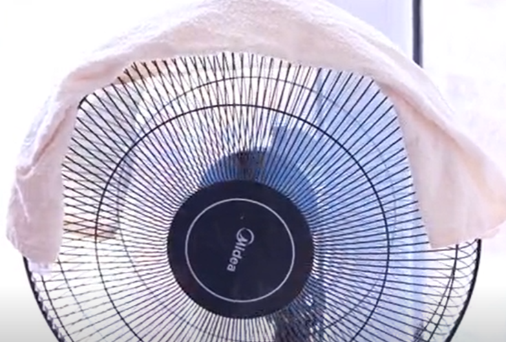 我们直接将毛巾搭在电风扇网罩上,然后打开电风扇开关,你会发现吹出来的风非常凉爽舒适。为什么这么说呢?因为毛巾属于半干的一个状态,风叶加速水分不断释放出来,可以带走周围的热量,可以让吹出来的风更加凉爽舒适,比开空调还要舒服,非常的不错。