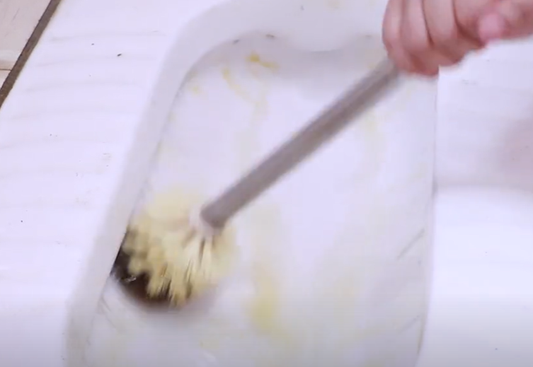 接下来,直接准备马桶刷刷试一下。食盐带有颗粒感,可以增大一个摩擦力,快速的去除马桶里面黄渍污垢。