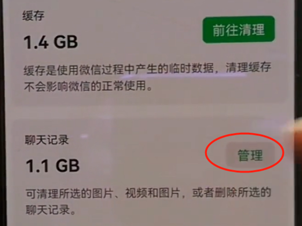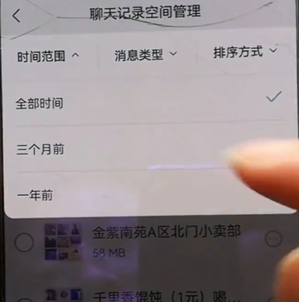 在这里的话,我们可以点击管理聊天记录进行管理,这里边会有一些分类,比如说时间范围或者是类型,类型包括图片、视频文件,我们可以进行一个分类,比如说想清除视频的话,我们点击视频就可以直接清除视频了,或者是想清除图片,也可以选择相应的一些文件进行清除。