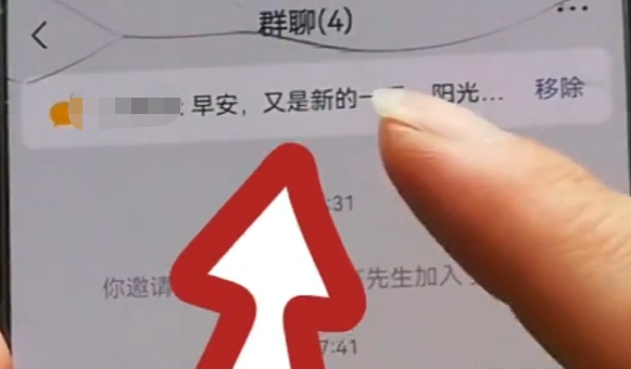 大家可以看一下,比如说我们打开群了以后,我比如说我们打开群以后,上边儿会直接显示,这是群消息置顶的一个功能。当然取消指的也是非常容易,在这里我们可以点击右右侧这个移除选项,就可以把这个置顶移除了。这功能可以说非常实用,比如说有几百人的大群的话,可以通过这种方式来提醒群成员。