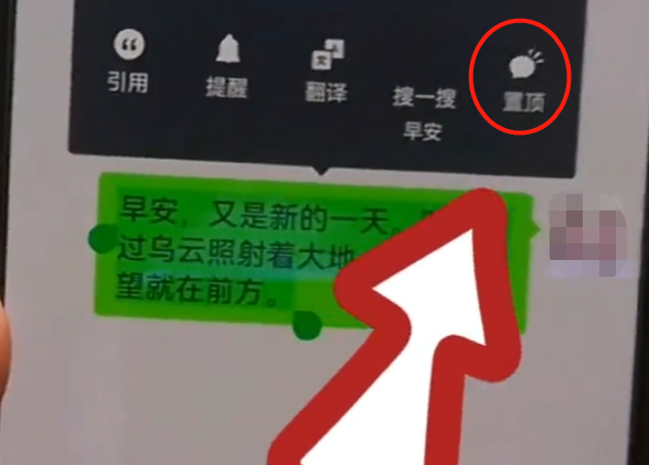如果几百人的群,好多人可能发现不了,我们发送了以后,这时的话需要我们长按这句话,大家可以看一下,长按这句话以后,右下角会有个置顶的选项,我们点击一下,这样的话你的群消息就可以直接置顶了,此消息将在群成员聊天儿中置顶。