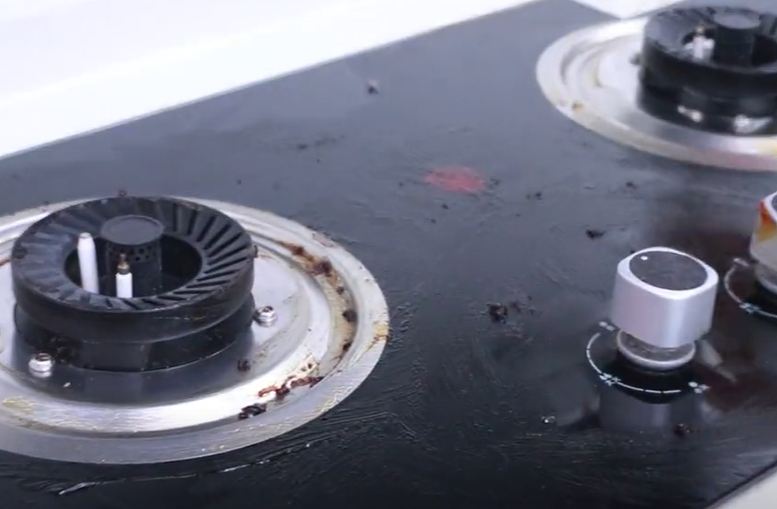 第一个用途就可以用来清洁灶台油污,效果非常的不错,大家可以看到灶台上有很多的油污垢,非常的脏,