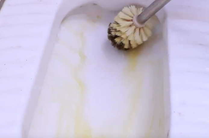 第四个用途还可以有效清洁马桶里面黄渍,效果非常的棒。大家可以看到马桶里面有很多的黄色污垢,又脏又臭,不用担心,直接将白醋洗衣粉的溶液喷洒上去,让它静置两分钟。接下来准备马桶刷刷试一下。这是因为白醋里面含有醋酸,消毒和杀菌,还可以软化黄色污垢。接下来,用洗衣粉里面的溶液将它全部清洁干净,因为洗衣粉的去污能力非常的强,