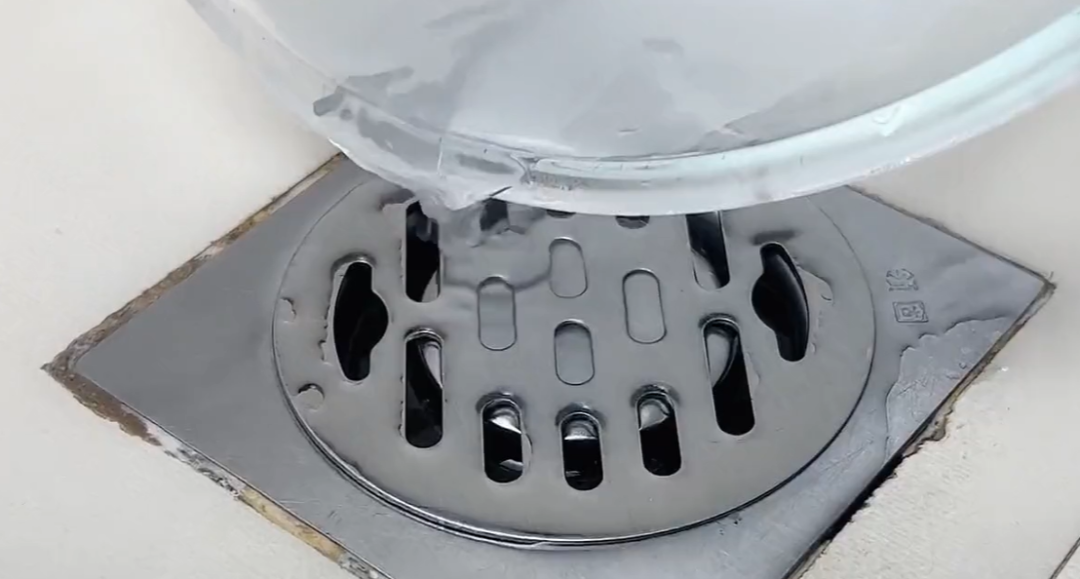 这时候我们就可以把用剩下的食盐粉倒入滚烫的热水,一定要滚开的哦,水温不够都不行。搅拌溶解,我们就可以把准备好的浓盐水倒到地漏里面,慢慢的顺着管道的四周往下倒。因为排水管里边,都会有这个弯折的地方,浓烟水就可以在里边存留一段时间,这样就可以清洁下水管道和内部的一些污垢,从而减少异味的产生。