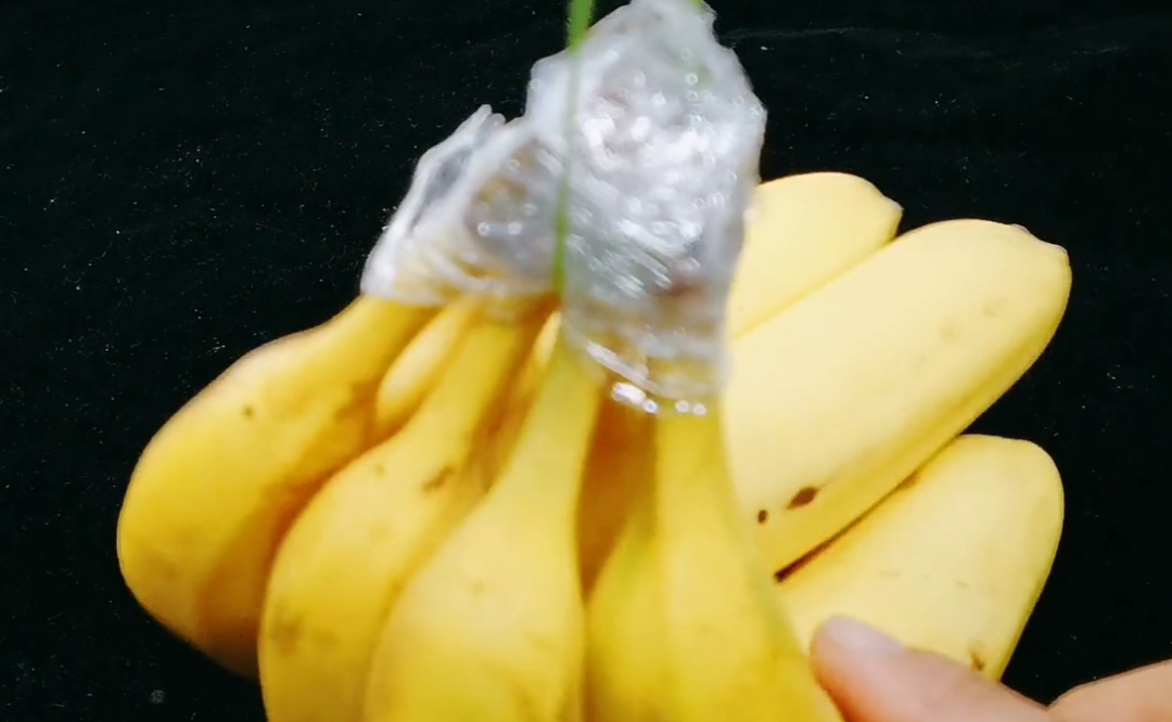所以提醒大家,香蕉一定不要放冰箱保存,我们可以将香蕉根部用保鲜膜包起来,用绳子将香蕉挂起来保存,这样保存时间要久一些,因为香蕉的根部会释放乙烯气体,而乙烯可以加速香蕉自身变褐变熟,裹住香蕉根部,可以缓解香蕉成熟进程,延长保鲜时间。