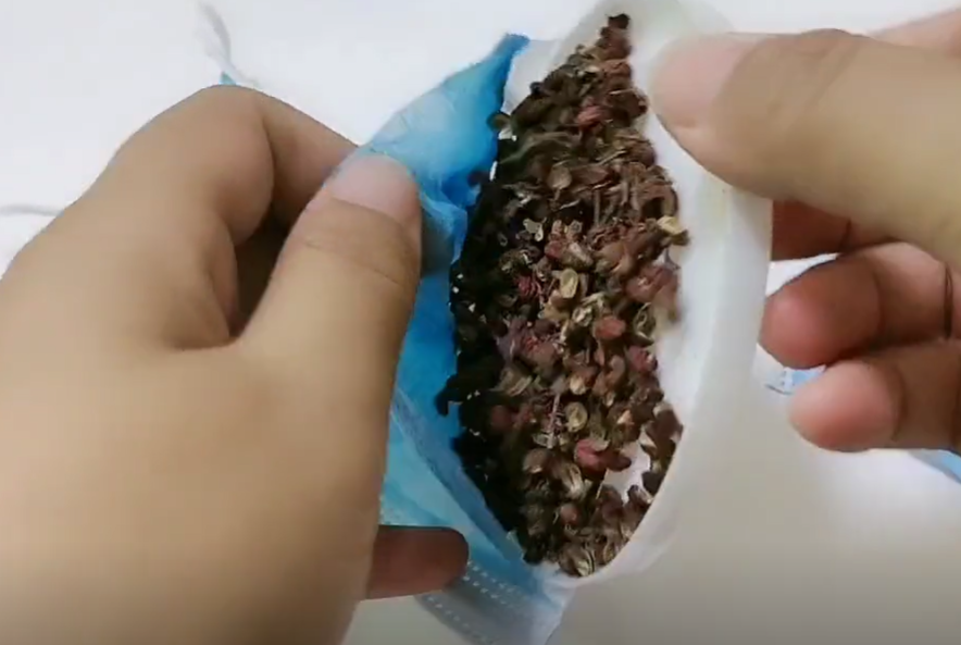 我们准备一把花椒,把花椒倒进我们的口罩里边,