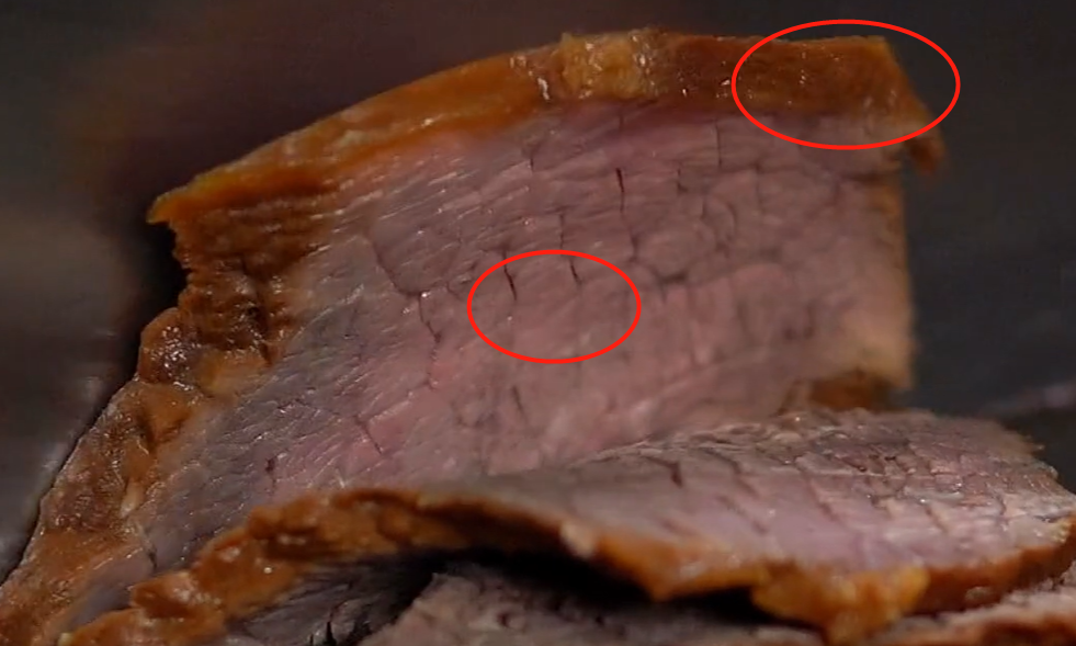 这里教大家如何识别亚硝酸盐卤菜。当你买肥卤菜,比如说卤牛肉,我们用刀切开,如果牛肉表面和里面都呈深粉红色,就像平时大家吃过的火腿肠那种颜色,这一定是使用了亚硝酸盐的卤牛肉。因为正常卤菜上色是用糖色或者是植物提取上色,卤出的颜色只在表面,不会渗透在肉里面,只有亚硝酸盐才会渗透到肉里面。为了自己的健康,所以大家买卤菜时也要多长一个心眼。