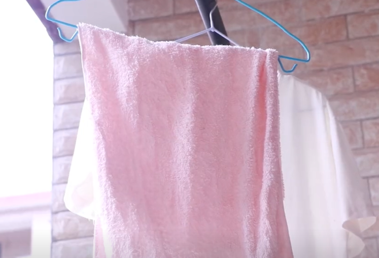冲洗干净之后将它晾在阳台,阳台有阳光,可以快速晾干,然后大家可以看到最后的效果,清洗干净晾干之后的毛巾变得非常柔软,毛巾没有任何的异味,上面还带有淡淡花露水的香味,效果非常的不错,下次你可以用上这个方法。