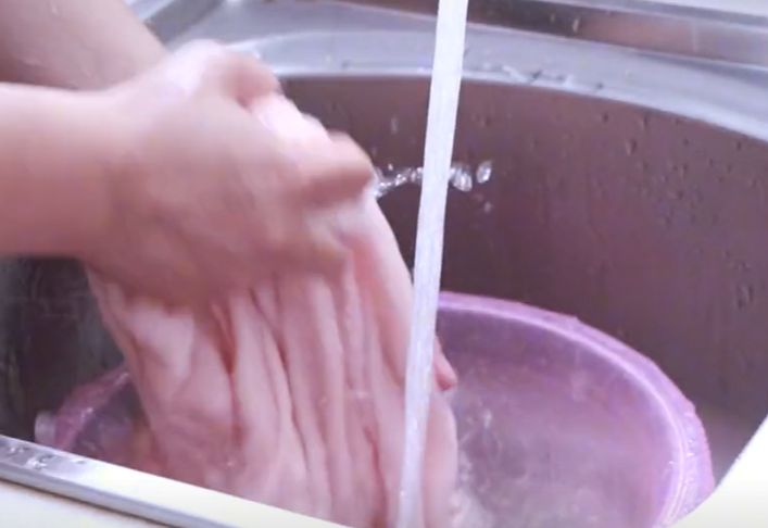 接下来,我们直接用流动清水将毛巾给它冲洗干净,