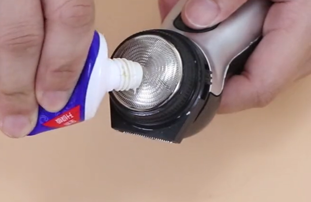 接下来,我们直接准备牙膏给它涂抹上去,我们只需要涂抹一点点,因为牙膏的清洁能力非常的强,同时牙膏里面含有研磨剂,可以增大一个研磨效果,增大一个摩擦力,这样刀头就可以变得更加的锋利。涂抹好之后,接下来我们直接打开开关,让它空转两分钟就可以啦。