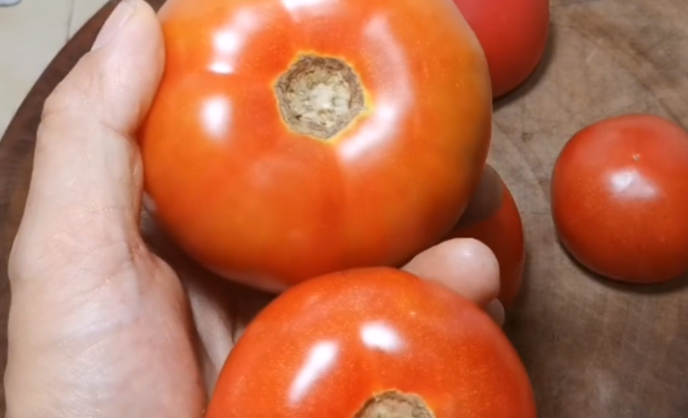 第四点看果蒂,自然成熟的果蒂是红绿相间,如果是催红的西红柿,它的果粒是发黑的,大家都要注意。