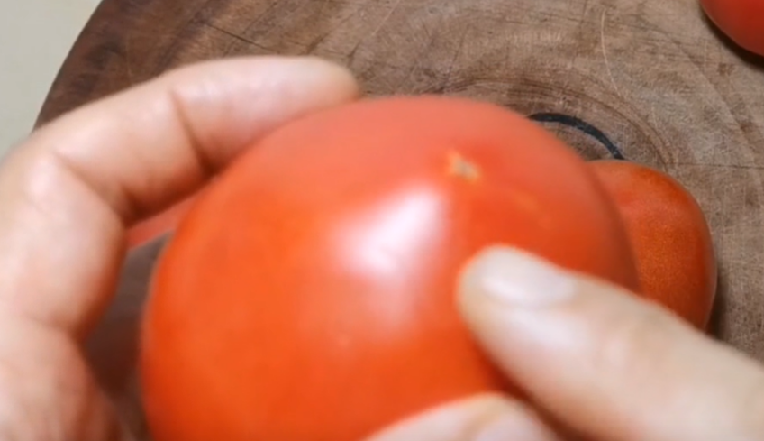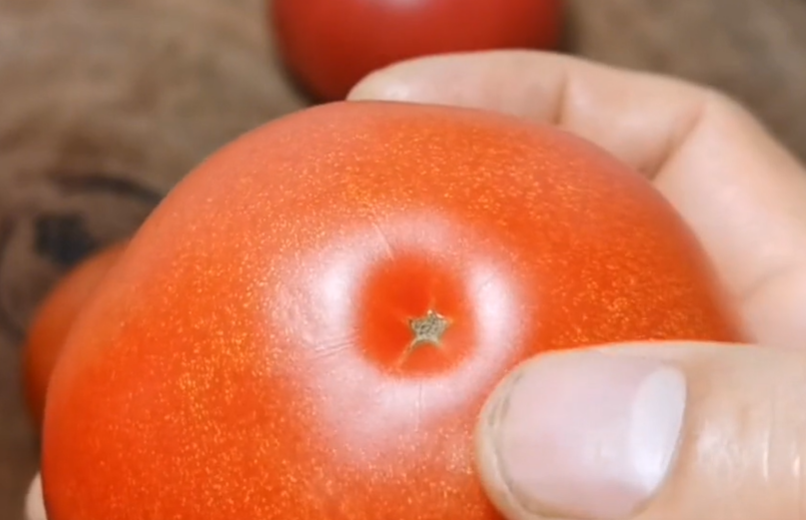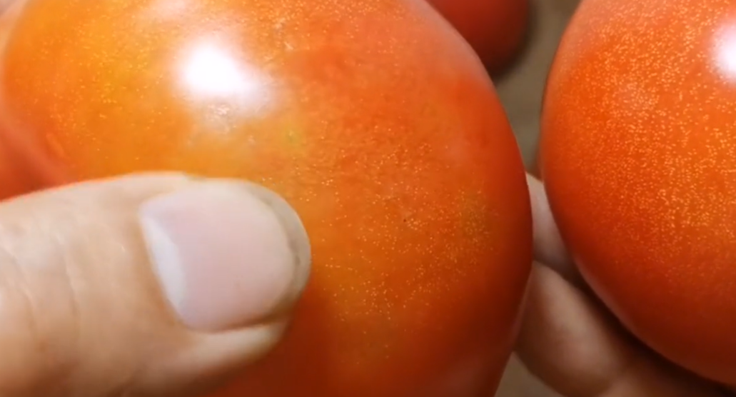 第二是看形状。大家可能买西红柿也遇到过,有的西红柿这周围棱角比较多,比较突出,像种西红柿就是催熟的,我们正常成熟的西红柿,它比较饱满,没有突出的棱角,并且我们用手捏,正常成熟的西红柿,它捏上去有弹性,它会弹回来,那种人工催熟的西红柿,它捏上去很硬,基本上没有弹性。