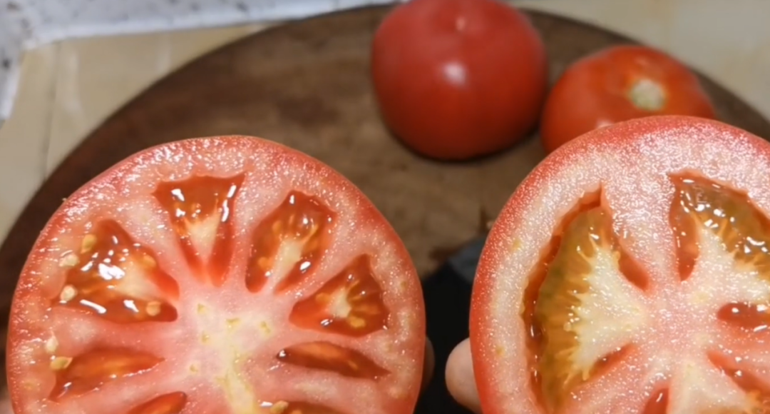 最后我们将西红柿切开看一下。两个西红柿切开后,大家一眼就能分出哪个西红柿是自然成熟的,哪一个是人工催熟的。