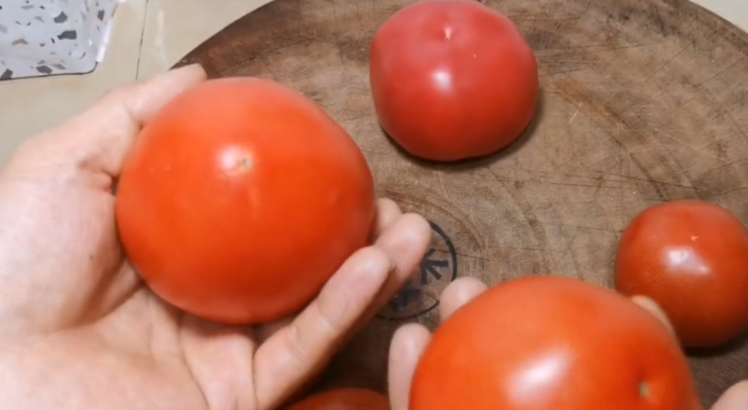 第三,我们掂重量,同样大小的西红柿拿在手中,重量越重的西红柿,它的成熟度越高,因为它的水分更多,如果说重量比较轻的西红柿,它一般是催熟的,里面是空心的。