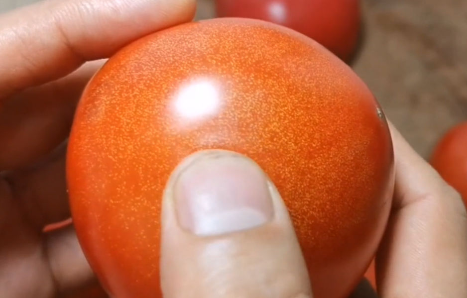 第五点,我们用手捏,如果同样是看到非常红的西红柿,你不知道哪一个是自然成熟的,哪一个是人工催熟的,我们用手捏上去,西红柿果肉有弹性,并且比较软的,这种西红柿是自然成熟的,如果捏上去果肉没有弹性,弹不回来,并且比较硬,像这种西红柿多半就是人工催熟的。