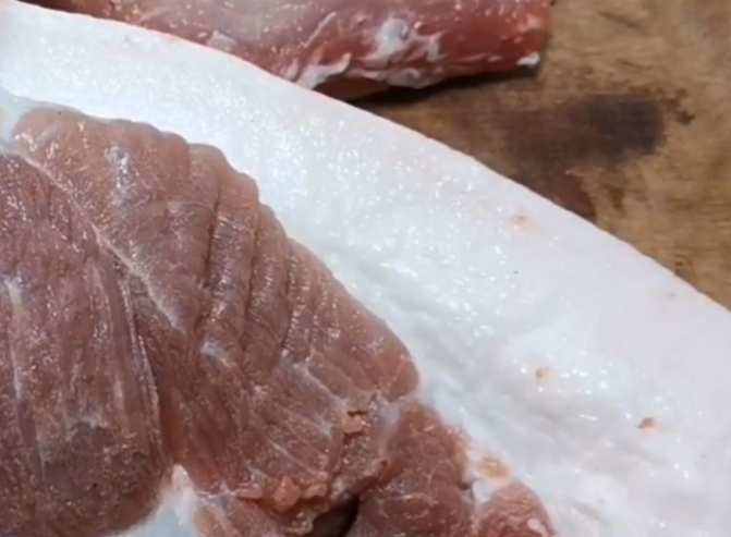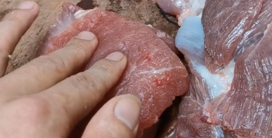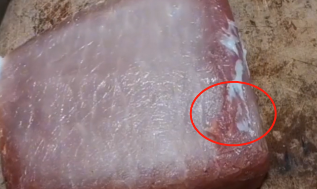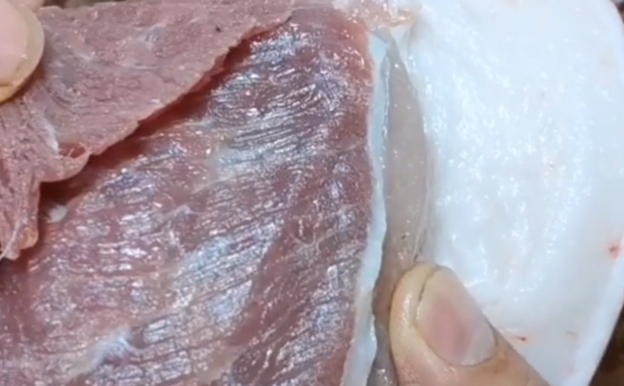 第三点我们用手去按,我们按,它基本上弹不回来,或者是弹得很慢很慢。并且你一按过后,这个周围就感觉有渗水的感觉,这个水质就出来了。对,里面这就是注水猪肉的表现。看我们正常猪肉,正常猪肉,我们用手去按它,你一按它就弹飞了,你看它的弹性相当好。