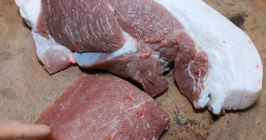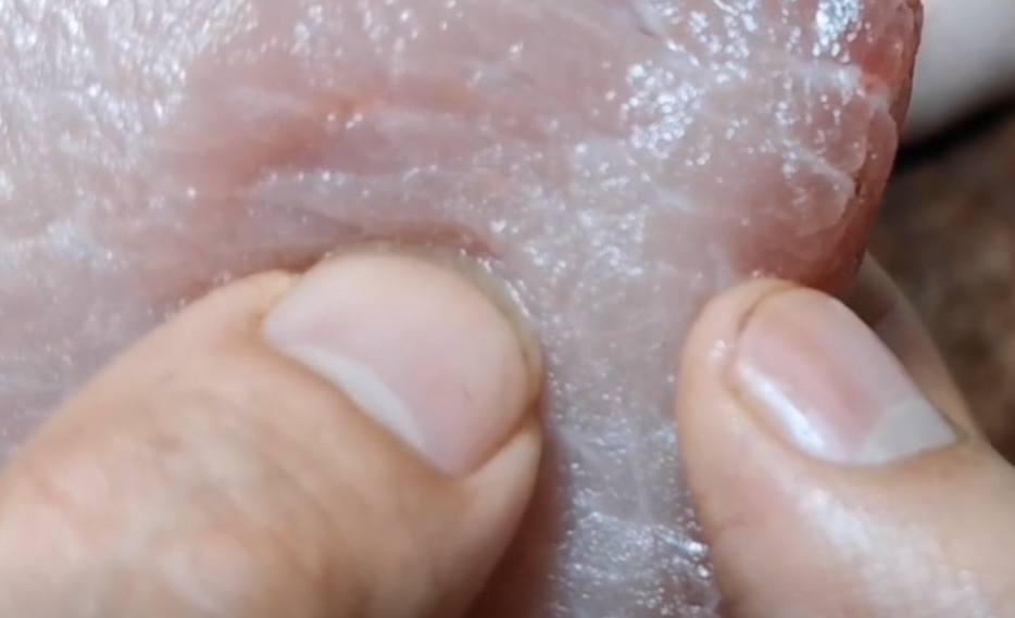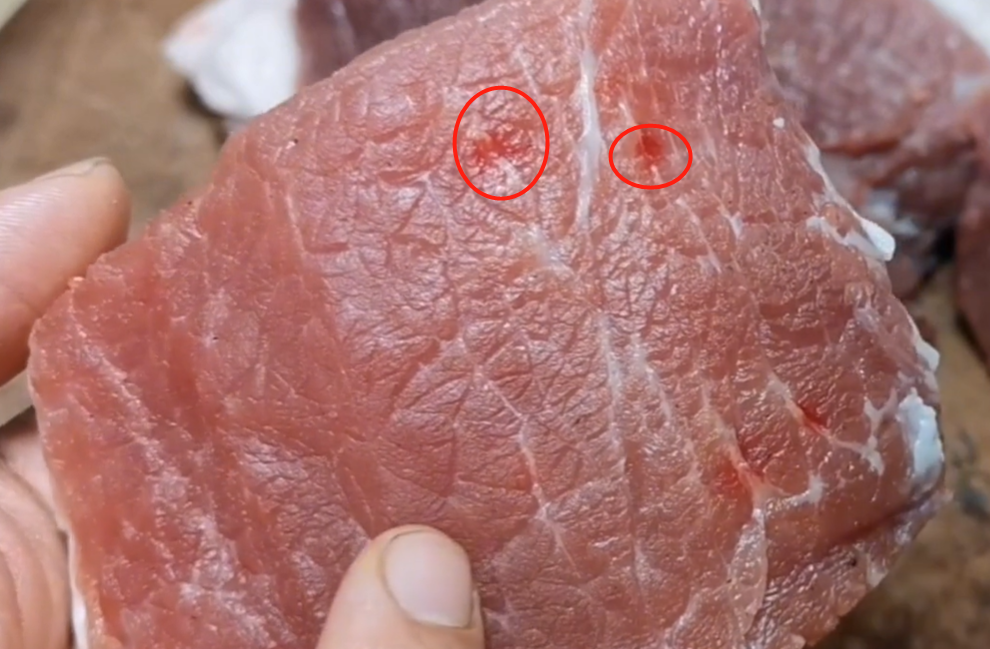 大家仔细看一下这块肉,它上面有很多出血点,有出血点的肉的话,多半就是猪有问题,要么就是死猪,它才会出现肉里面出现这种红色的血点。我们用刀先将这个肉表面切开,大家再看一下,我们将面上这个鲜艳的这一面片开来,看一下里面是什么样的。朋友们看出蹊跷了吗?这个叫表里不一,我们好的猪肉它是表里一样的,里面外面都是一个颜色。大家有没有买到这种肉?