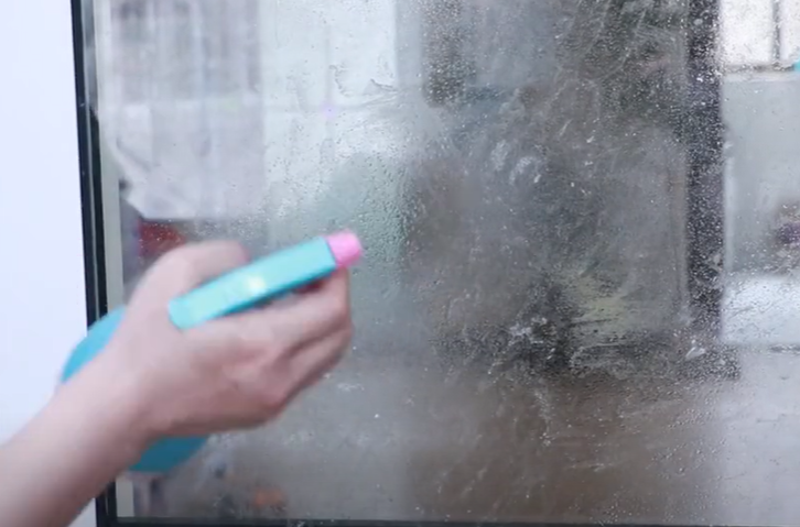 第二个用途,还可以用来擦玻璃,大家可以看到厨房的玻璃上面有很多的油水渍,非常脏。我们可以直接用上这个溶液喷洒上去,让它静置两分钟,