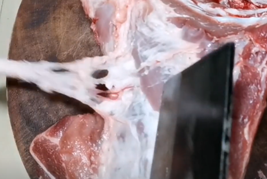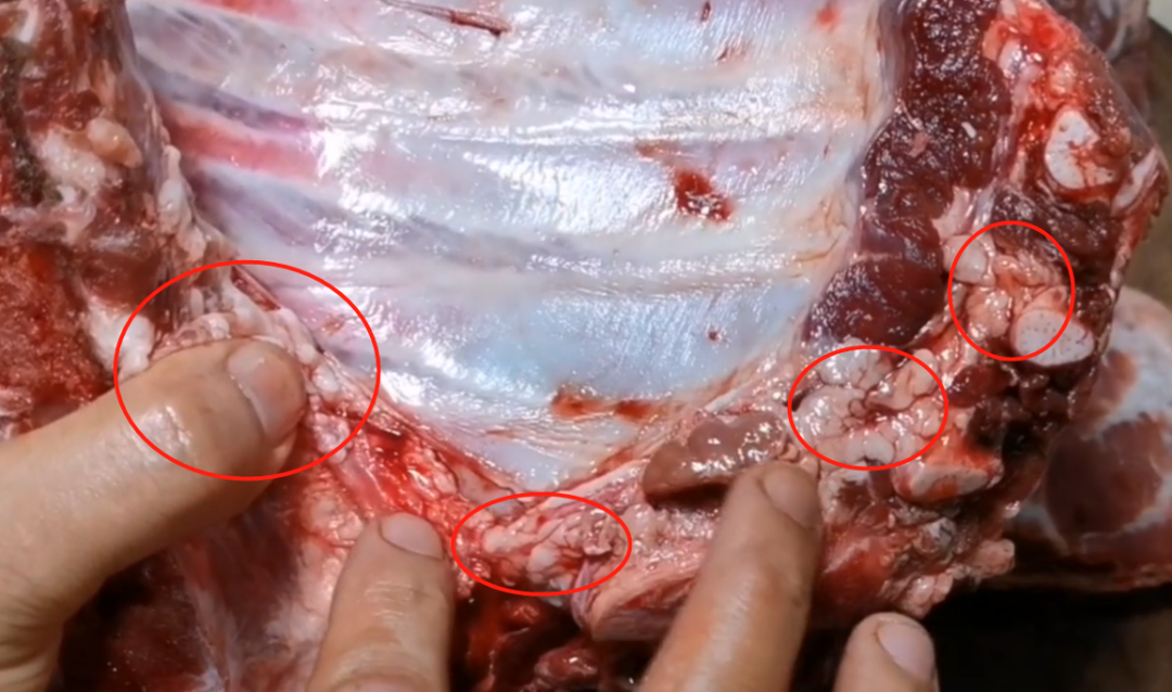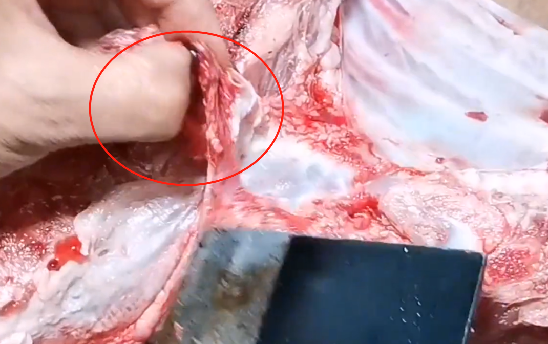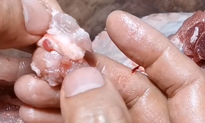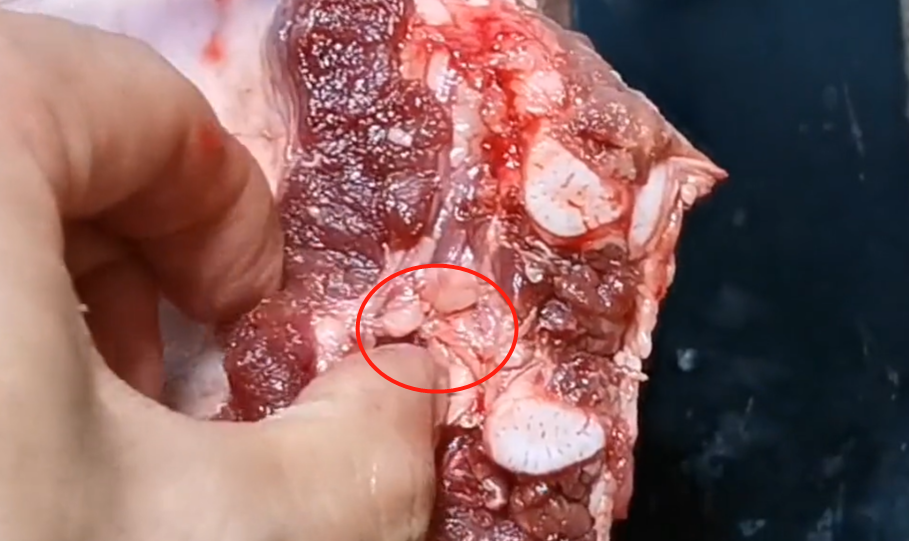 所以如果说大家买前排的时候,一定要仔细看清楚,把里面这些肉疙瘩啊淋巴结呢,这些东西全部剔除干净,这个吃了对人身体非常有害,这些肉疙瘩都是包在肉里面的,你不仔细甄别,跟这个肉颜色都一样的,很容易被忽略。淋巴结,甲状腺剔除干净后,