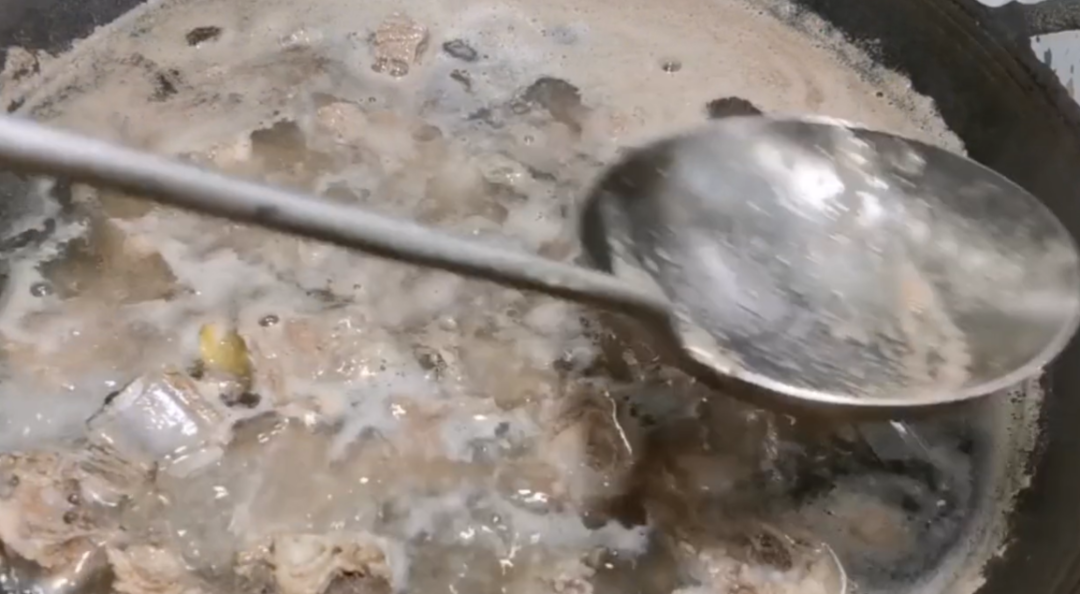 水涨后,我们将面上的浮沫打掉,两分钟后,我们将排骨打起来,排骨打起后,这时候再加入清水将它清洗两遍。