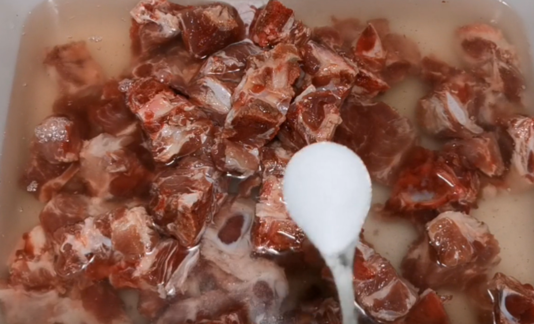 排骨剁好后,我们将它装入盆中,第一步就是去除排骨上面的血水,因为排骨的血水腥味比较重,用清水将排骨浸泡,如果我们是赶时间的话,可以在里面加一点盐,用手使劲抓,将血水抓出。