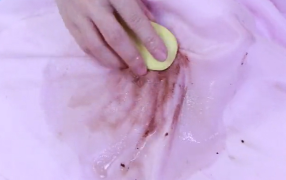 涂抹好之后,接下来我们放在水中的给它搓洗一番,用上这种方法,硫磺皂中的硫元素就可以快速与血液中的铁元素相结合,快速的去除上面一些血渍,