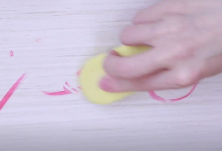 我们直接使用上硫磺皂来帮忙,我们粘取适量水进行擦拭,因为硫磺皂中含有硫元素,可以快速的软化这些笔渍,而且非常润滑的,我们摩擦一会儿之后上面些脏东西几乎已经软化,