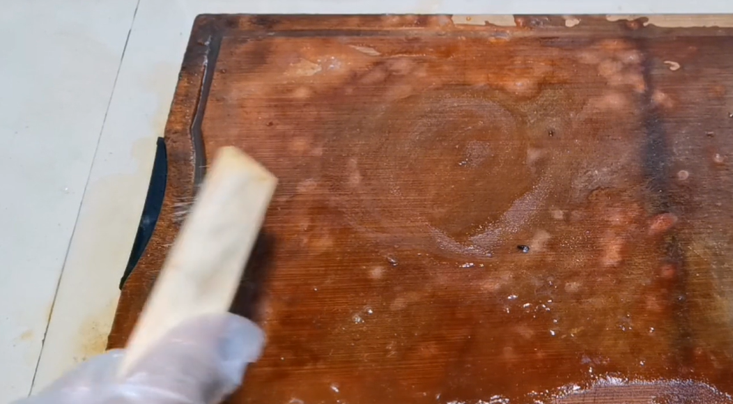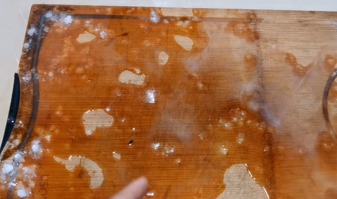 如果你们家的菜板有发黑、起霉,有异味,大家可以用今天这个方法将菜板清洗干净,这样清洗后的菜板,它的所有细菌,包括黄曲霉素都可以清除干净,因为黄曲霉素的克星就是强碱,大家以后再保养菜板的时候,每一周可以将菜板上面撒一层盐,因为盐可以杀菌,再一次可以防止菜板开裂。