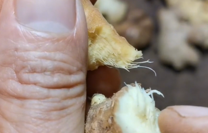 第四点我们就是将生姜掰开。掰开后,这个姜它的丝状物,如果是这种白色,白亮的这种姜就是好姜,掰开后,如果这个丝状膜像这种呈暗黄色,暗色里面暗色,暗黄色这种姜,这个姜就不要买了。