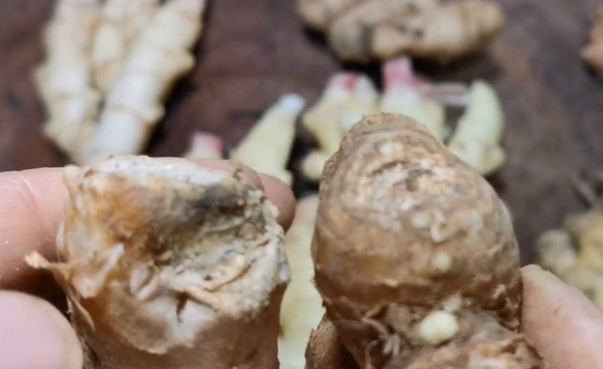 第二点我们就是用手捏,你们看一下像这种加工的姜。这种硫磺侵泡过的姜。它比较软烂,这些地方,这些根部都开始发烂,正常地姜它比较硬,比较硬朗,它不会烂。这个你看就软烂了,这个表皮非常脆。